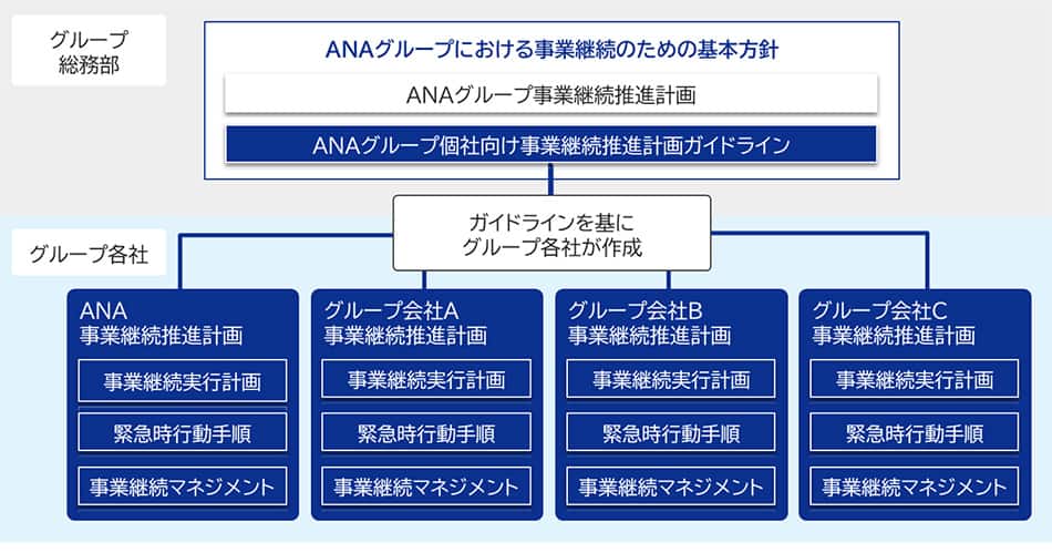 ANAグループでは、事業活動が一時的に停止するような状況においても、お客様・役職員等の安全の確保や、経営や社会に対する影響の極小化など、事業を可能な限り早く常態に復旧させるための備えとして、特定の災害にとらわれないオールハザード型の「ANAグループにおける事業継続のための基本方針」を定めています。その方針に定められた事業継続推進計画ガイドラインを基に、グループ各社では事業特性に応じた各種マニュアルを作成しています。また、継続的改善を図る事業継続マネジメント(BCM)を推進し、有事の際、迅速に対応できる体制づくりに努めています。