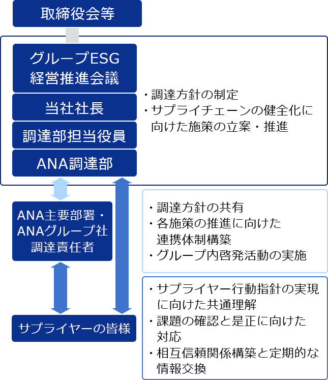 ANAグループの責任ある調達を推進するため、ANAグループ主要部署に『調達責任者』を選任し、サプライヤーの皆様と共に持続可能な社会の実現に向けて取り組みを進めていきます。