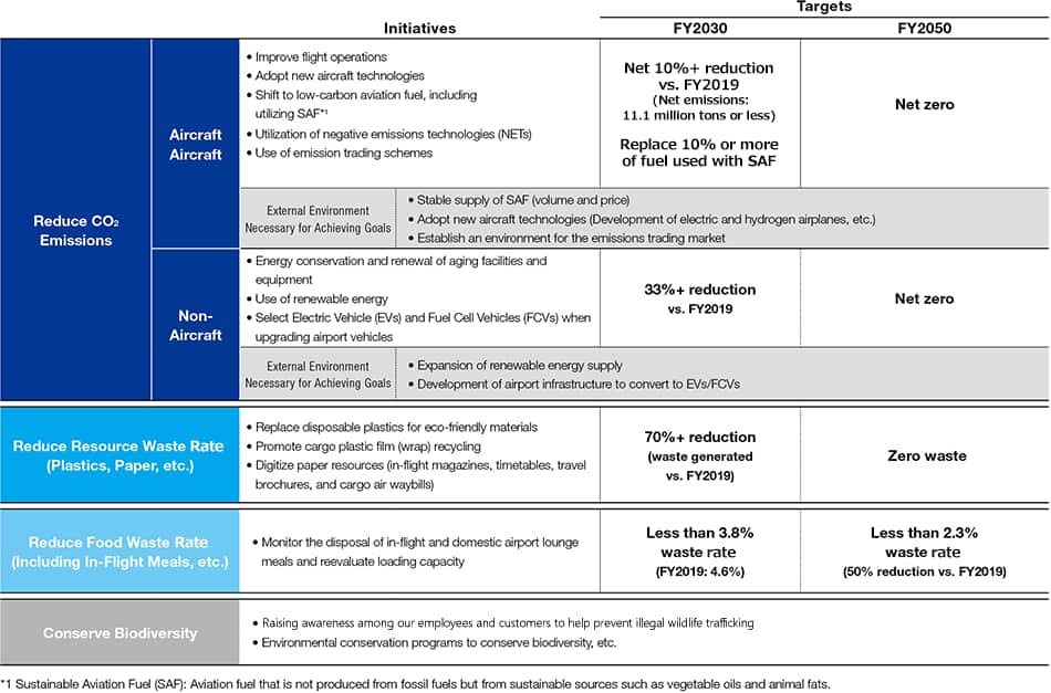 | CO2 emissions generated by aircraft flight operations | 10%+ reduction vs. FY2019 (Well below approx. 11.1 million tons levels), net |