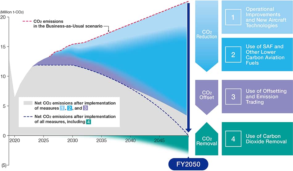 To achieve this goal, we will combine four strategic approaches (operational improvements and technological innovation of aircraft, etc., low-carbon aviation fuel through the use of SAF, emissions trading, and negative emission technologies*1), with the use of SAF at the core. We will achieve carbon neutrality by FY2050 while also pursuing compatibility with economic rationality.