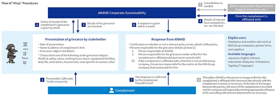 | Grievance contact point, "Ninja" | Workers engaged in the ANA Group's supply chain | It is a platform for listening to voices regarding infringement of human rights, targeting workers engaged in the ANA Group's supply chain (not preventing use by the employees of the Group companies). This is a contact point offered and operated by a third party organization, CRT Japan, accessible in 7 languages, and can be used anonymously without fear of disadvantage. It is also possible for the caller to report under his or her real name if he or she so desires. A user raises an issue, and the ANA Group provides a reply that confirms the availability of policies relating to the issue and includes information for two or more contact points for the user to take further actions regarding the issue. This contact point is intended to prevent an issue from becoming more serious with a user not knowing where to consult for the issue. |