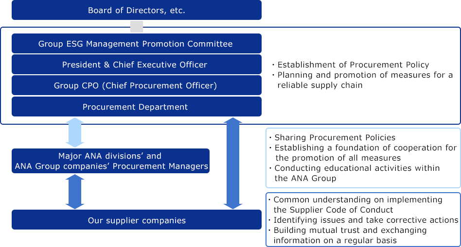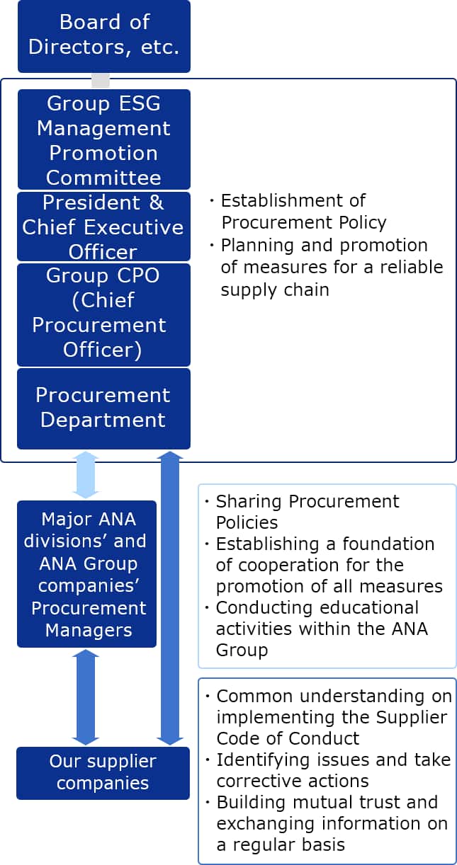 In order to promote responsible procurement in the ANA Group, we have appointed 'procurement managers' in all major departments to manage initiative, and to work with our suppliers to achieve a sustainable society.