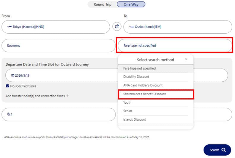 From the domestic flight top page on the ANA Website, enter your search criteria then click Fare type not specified and select Shareholder's Benefit Discount.