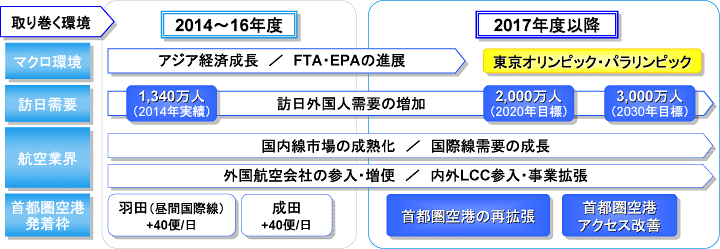 2020年開催予定の東京オリンピック・パラリンピックを踏まえ、日本政府は2030年までに訪日外国人旅行者数の目標を3,000万人と掲げており、それに向けた首都圏空港の再拡張や空港アクセスの改善が期待されています。少子高齢化や生産年齢人口の減少により日本国内市場は成熟しつつあつりますが、高い成長率で発展を続けるアジア経済やASEANにおける航空自由化の動きは日本やアジアの航空需要をさらに大きく伸長させる追い風となり、ANAグループの事業拡大を牽引するものと考えられます。