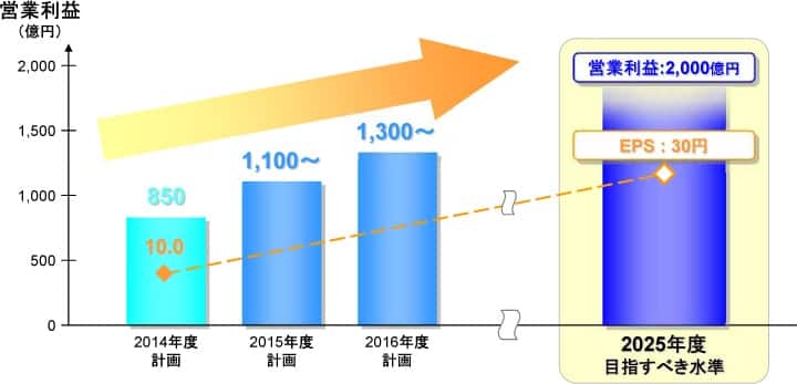2014年度の営業利益目標である850億円をステップとして、2020年の東京オリンピック開催も見据え、2025年度には営業利益2,000億円規模を目指します。健全な財務体質を維持しながら環境変化への耐性を高め、収益性の向上と株主還元を実現していきます。