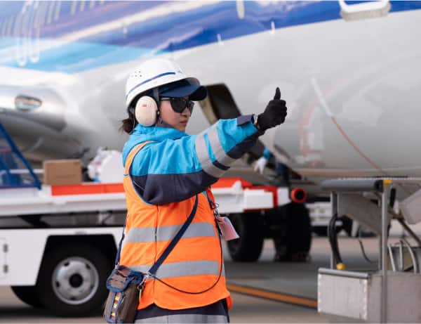 巨大な航空機の誘導、お客様の手荷物・貨物の搭載、空港で使われる特殊車両・機材の操作をはじめとした、地上での支援業務にあたる。