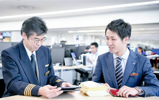若手が大きな仕事に携われるための仕組みやサポートは、もちろんあります。私の部署では、マニュアルを作る際にいろんな人のサポートを受けながら作り上げていきます。若手は担当マネジャーとペアになって仕事を進めるので、いつでもアドバイスを聞けますし、作成したマニュアルの点検過程では、マネジャーやリーダー、部長と話し合い、完成度を高めていきます。さらに、機種それぞれについているアドバイザー役のテクニカルパイロットから、実際のパイロットの操作手順についてアドバイスをもらうことも可能です。周りからのサポートを受けやすい環境にあるため、安心して仕事を進めることができています。