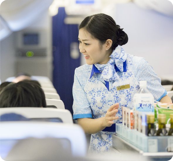 ANAのCAは、お客様に機内で快適に過ごしていただくために、あらゆる角度からお客様のフライトをサポートします。機内で行うサービスは決して同じ業務の繰り返しではなく、それぞれのCAがお客様一人ひとりに向き合い、想像力を働かせて、創意工夫を凝らしたサービスを行っています。