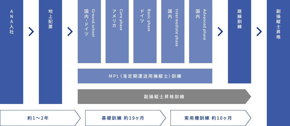 ANAの副操縦士となるための訓練です。乗務する航空機の免許を取得すると共に、ANAの運航乗務員として必要な経験・知識及び能力を付与するために実施します。基礎訓練からはじまった運航乗務員になるための総仕上げの訓練です。