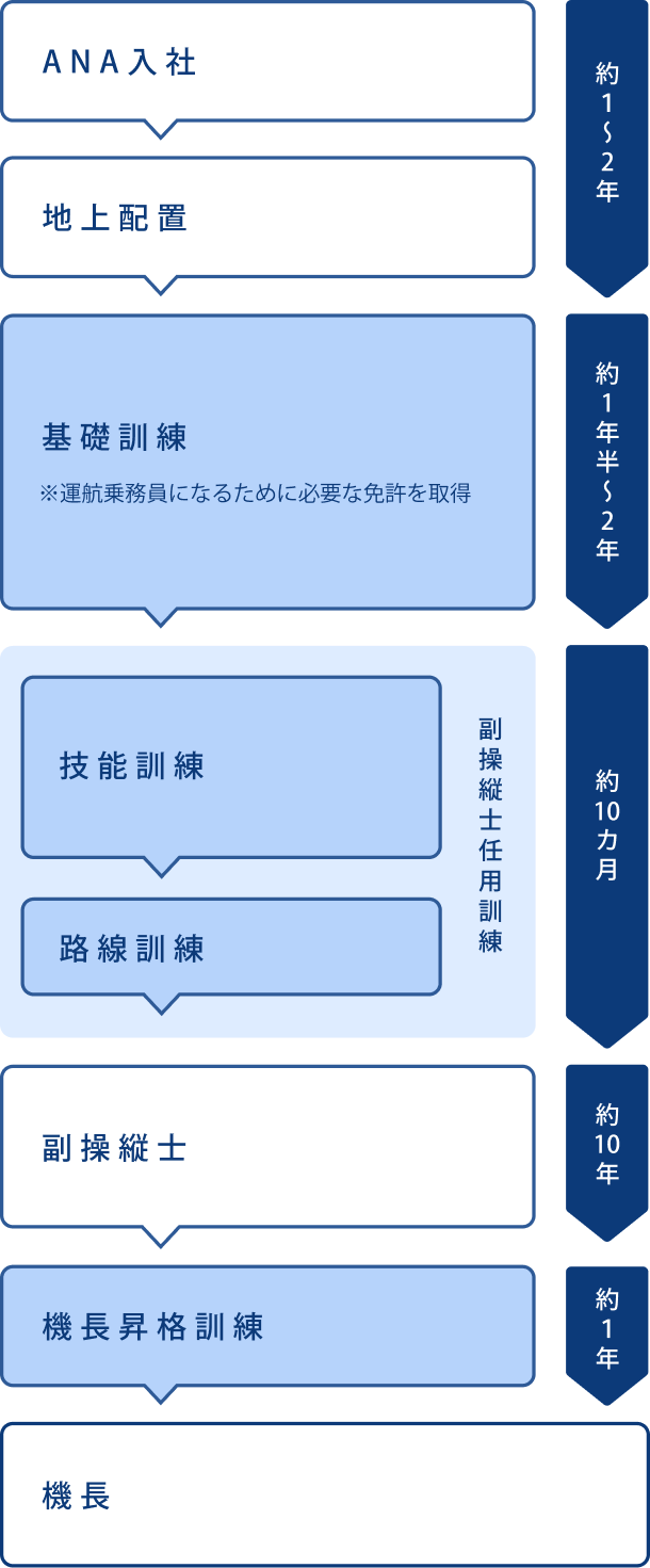 ANAに入社後、一から訓練を積み、パイロットに必要な資格を取得します。パイロットは一つひとつのフライトで経験を積みながら、長い時間をかけて高みを目指す仕事です。様々な航空機での訓練と審査を経て、訓練生、副操縦士、機長へとステップアップしていきます。副操縦士任用後、機長になるまでには約10年。機長になった後も、新たな機種の操縦資格の取得や後進の育成にも取り組み、パイロットとしての人間力と技倆を高め続けます。