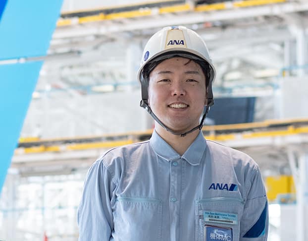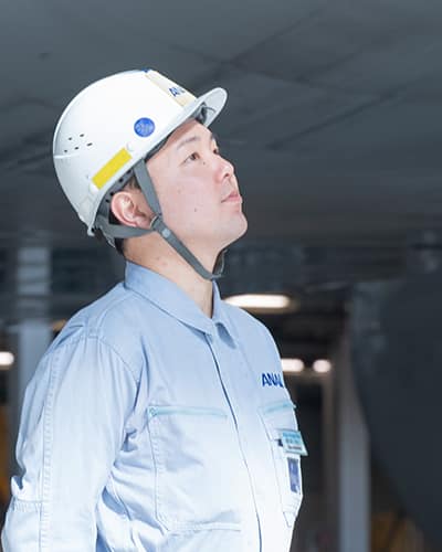 現在、「ANAベースメンテナンステクニクス 機体整備部」にて、羽田空港の格納庫を主な拠点として、ドック整備と呼ばれる航空機の重整備や、夜間における運航支援整備、地方基地で発生した不具合の緊急整備等を行っています。ドック整備では、飛行機の深部までアクセスして行う点検作業やランディングギア交換を行い、夜間作業ではエンジンの交換作業や運航便で発生した不具合の修復作業等を主に行っております。