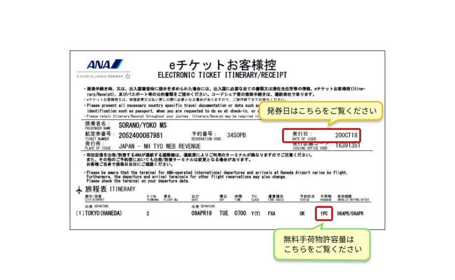 発券日と無料手荷物許容量の確認方法