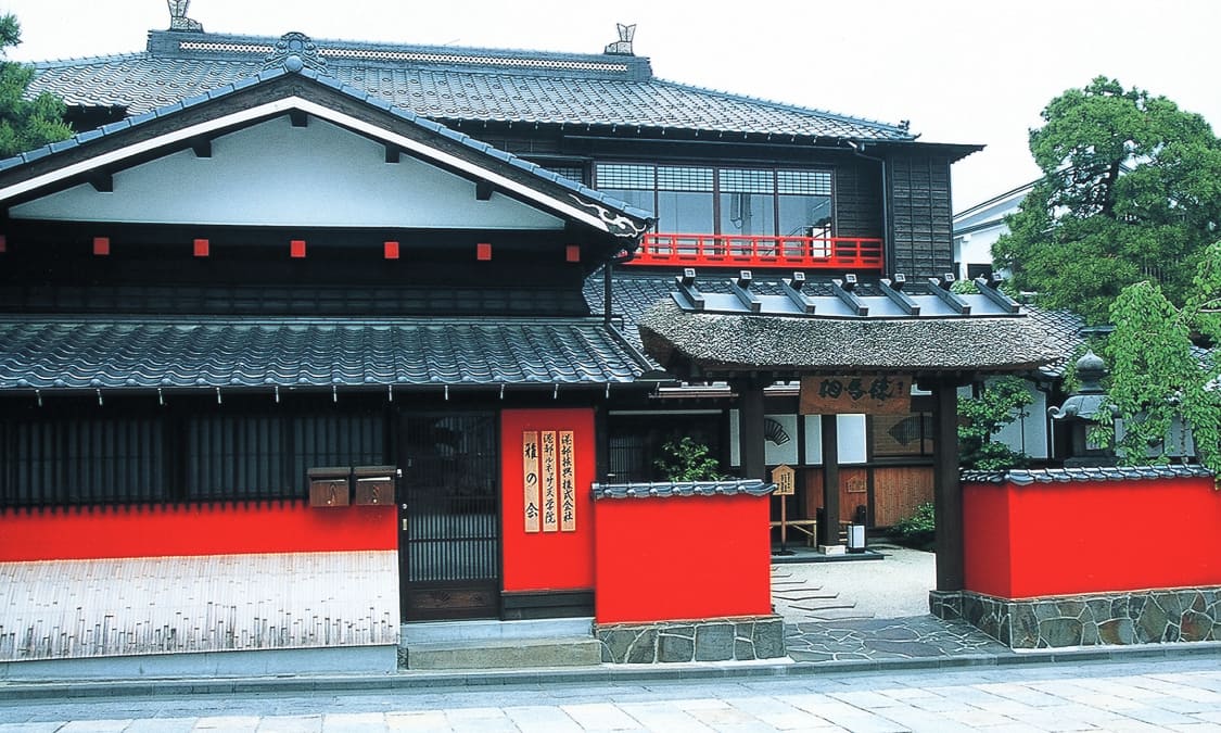 相馬樓前の道は石畳になっており、外観は茅葺の屋根と朱色の堀で時代をタイムトリップした感覚にもとらわれます。玄関を入ると金箔の松竹梅・扇・鼓のレリーフがあり、京文化で運ばれた雛飾りを連想させます。