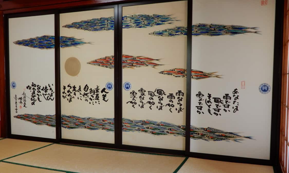 二階の客間では、詩遊詩画人「泉椿魚(いずみ ちんぎょ)」氏により描かれた椿と魚の襖が非常に印象的です。また、館内には竹久夢二美術館も併設されており、数々の貴重な美術作品に出逢える場所でもあります。
