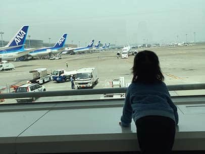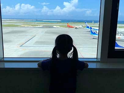 飛行機を見る女の子:再び、飛行機に乗って旅に出よう!
