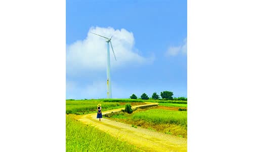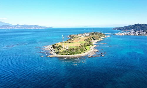 通詞島(つうじしま)は天草下島の北側にあり、1975年に開通した通詞大橋(184メートル)で天草下島とつながっています。島の周囲は約4キロメートル。200頭のイルカが生息しているのはこの島の近くです。島内には、風力発電の白い風車、特産・天草の塩(あまくさンソルト)の製塩所、地元の遺跡からの出土品を展示している歴史民俗資料館、人工温泉や食事が楽しめる眺望抜群の施設「ユメール」があります。美しい海を見ながらのんびりサイクリングやお散歩するのも楽しいですよ。
