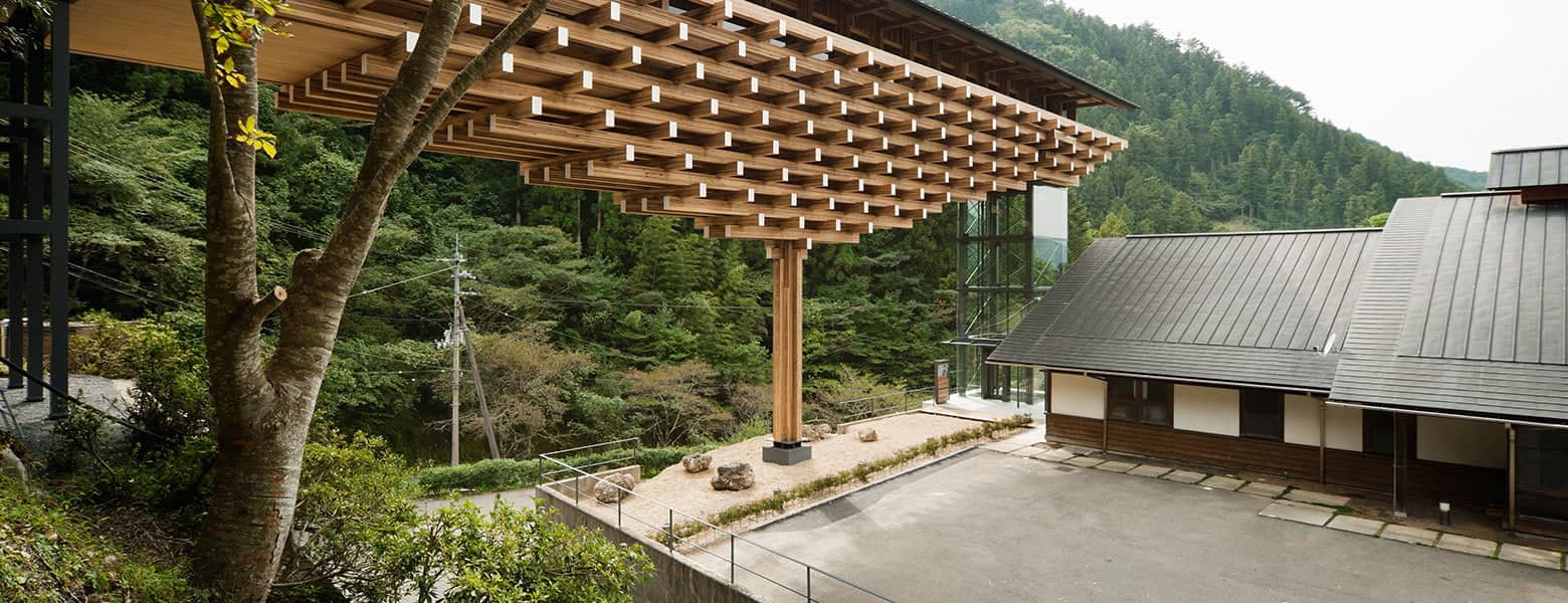 この町には有名な建築家・隈研吾の建築がいくつもあり、町全体がまるで一つのミュージアムのよう。橋の形をした「雲の上のギャラリー」の桁は、日本建築の軒を支える伝統工法「斗栱(ときょう)」をモチーフに、地元産の杉を使って組み上げられています。集成材を積み重ねることで軽やかさを生み、周囲の森に溶け込む美しい姿が実現しています。