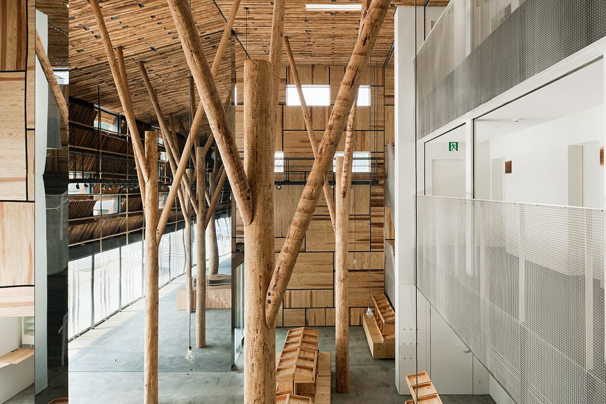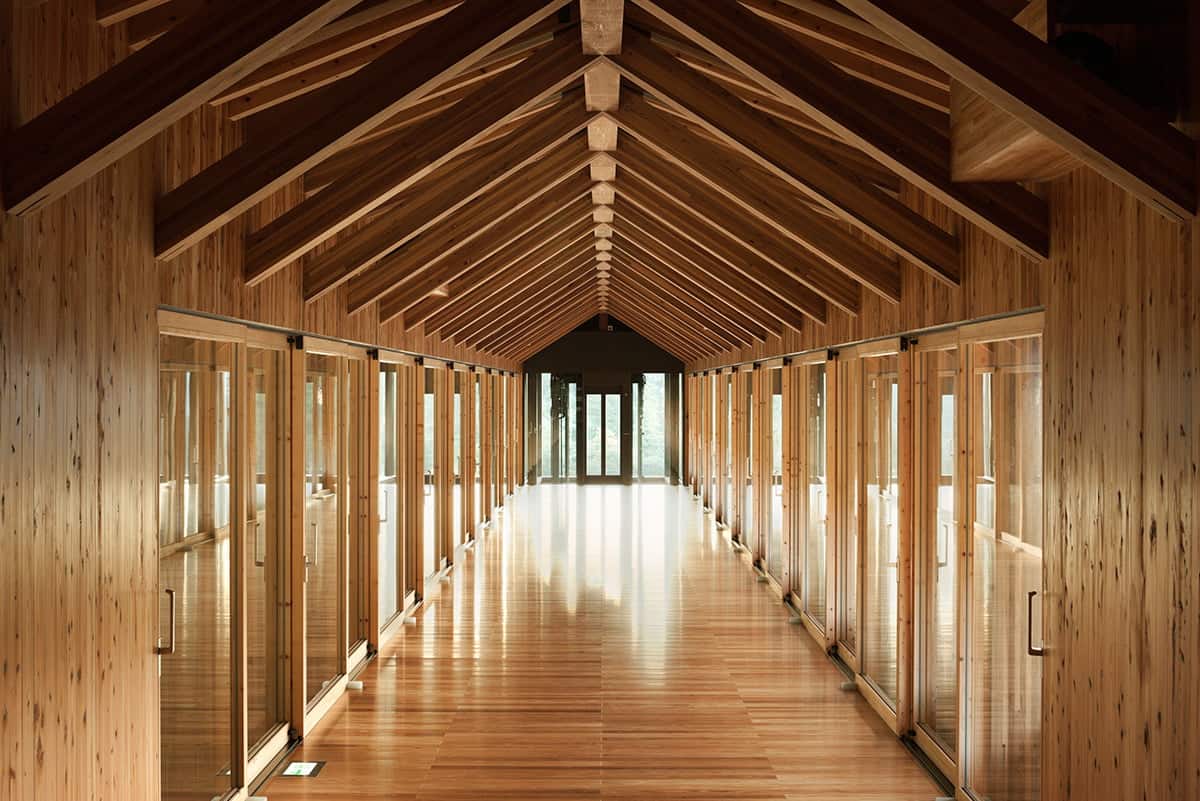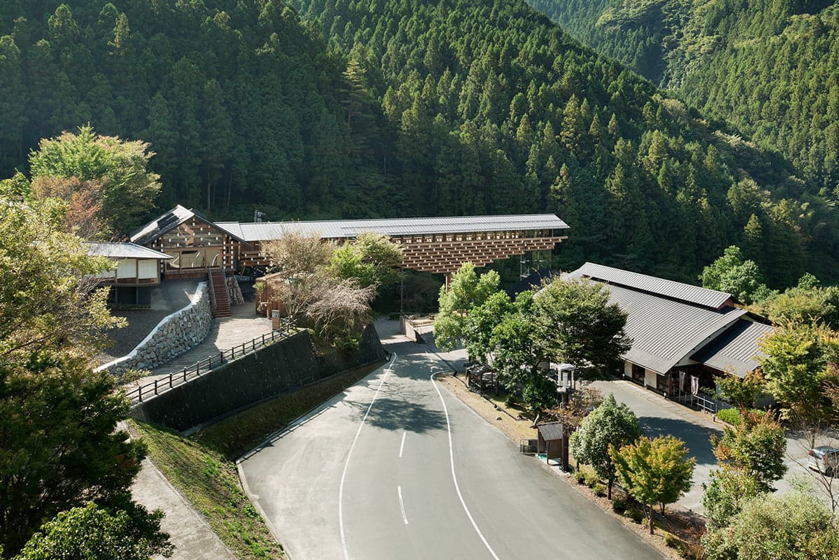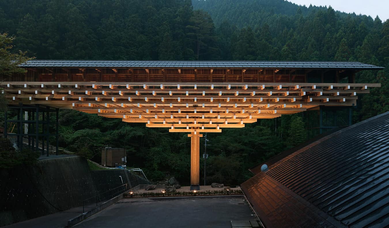 この町には有名な建築家・隈研吾の建築がいくつもあり、町全体がまるで一つのミュージアムのよう。橋の形をした「雲の上のギャラリー」の桁は、日本建築の軒を支える伝統工法「斗栱(ときょう)」をモチーフに、地元産の杉を使って組み上げられています。集成材を積み重ねることで軽やかさを生み、周囲の森に溶け込む美しい姿が実現しています。