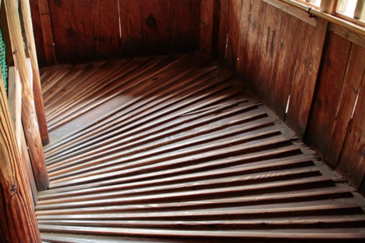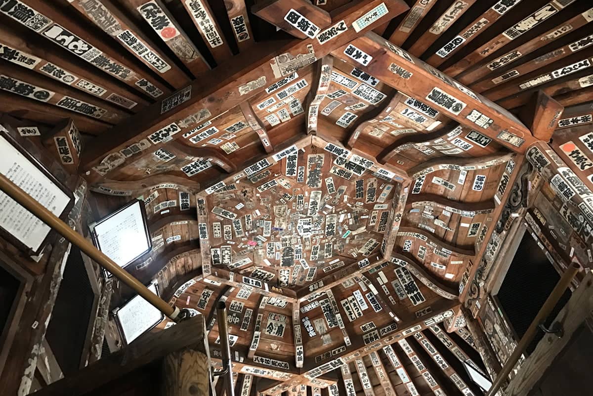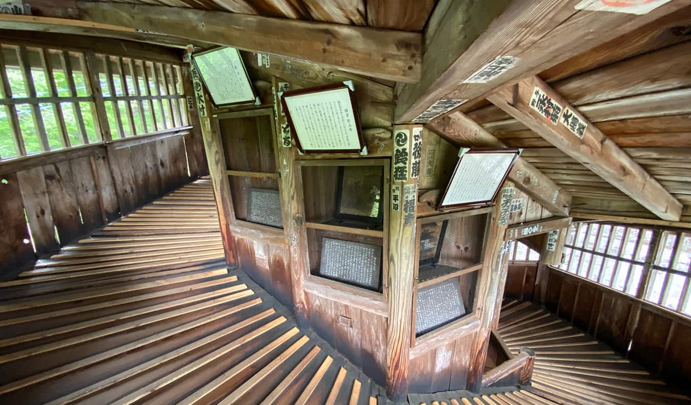 内部もまた、渦巻き貝の中を進むような螺旋構造のなんとも不思議な造り。さらに螺旋のスロープは二重になっており、上りと下りで別の通路を通るという世界でも稀な構造に。これは、多くの参拝者がすれ違うことなく安全に参詣できるよう意図されたもの。日本には、33か所の霊場を巡拝すると安らかな死後を迎えることができるという伝えがあります。元々会津さざえ堂には螺旋に沿って33体の観音像が置かれていて、一度にお参りすることができる場所だったのです。