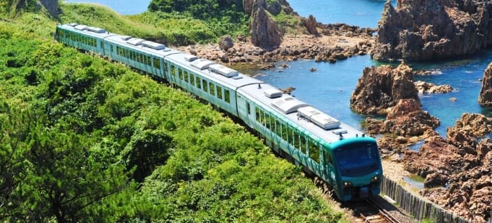 世界自然遺産白神山地と風光明媚な日本海を走る「リゾートしらかみ」。