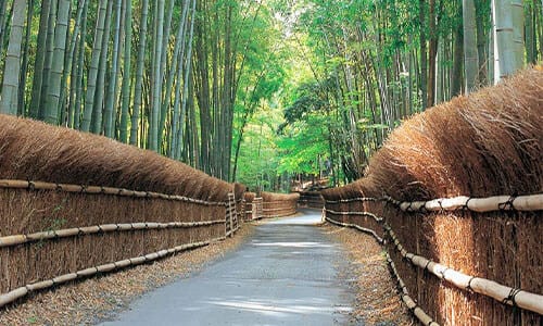 嵐山で絶大な人気スポットとなっているのが嵯峨野に広がる竹林です。野宮神社から天龍寺北門を通り、大河内山荘へ抜ける約400メートルの道に、手入れされた竹林が道の両脇に続きます。嵐山は平安時代、貴族の別荘地だったと言われています。竹林を縫うように小径が張り巡らされていて、のんびりと歩けば平安時代の貴族の気分。初冬には竹林の両側がライトアップされる「嵐山花灯路」が開催され、昼間とは違う雰囲気を楽しむことができます。
