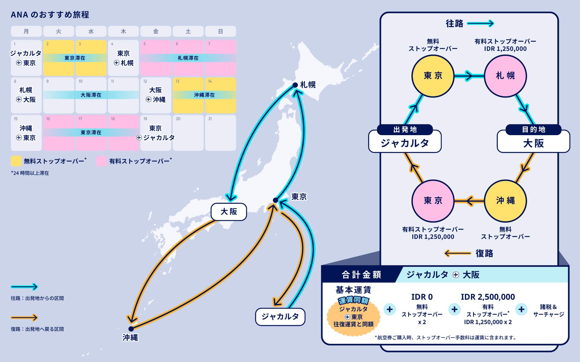 ANAならストップオーバー*が往路・復路でそれぞれ最大2回まで可能です(それぞれ1回目は無料、2回目は追加料金 IDR 1,250,000)。