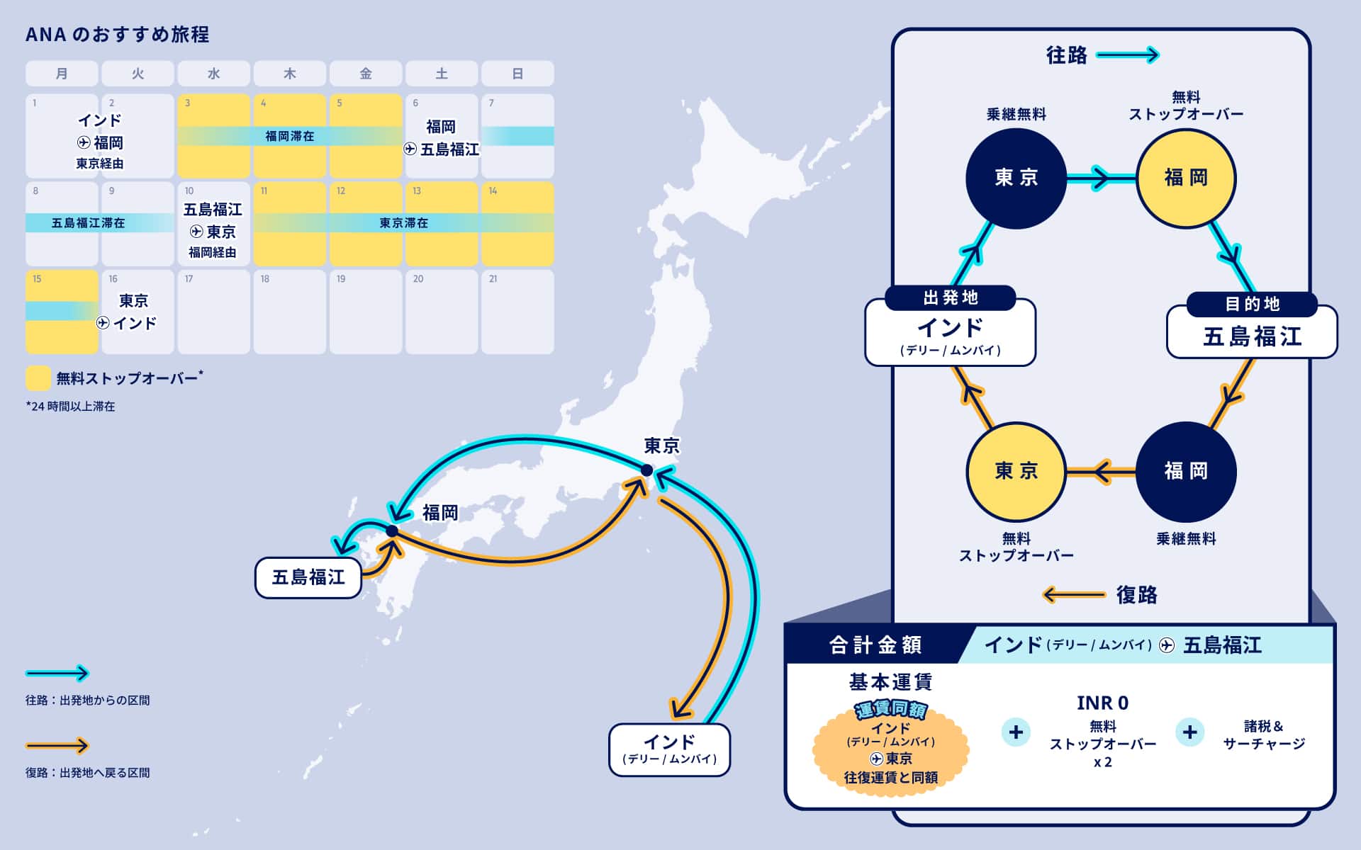 ANAならストップオーバー*が往路・復路でそれぞれ最大2回まで可能です(それぞれ1回目は無料、2回目は追加料金 INR 6,800)。