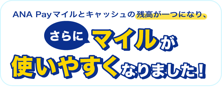 ANA Payは「ANA Payキャッシュ」と「ANA Payマイル」の2つの残高からお支払いいただいていましたが、2025年1月28日に「ANA Pay残高」として1つの残高に統合され、チャージも決済も一つの残高からスムーズにご利用いただけるようになりました。