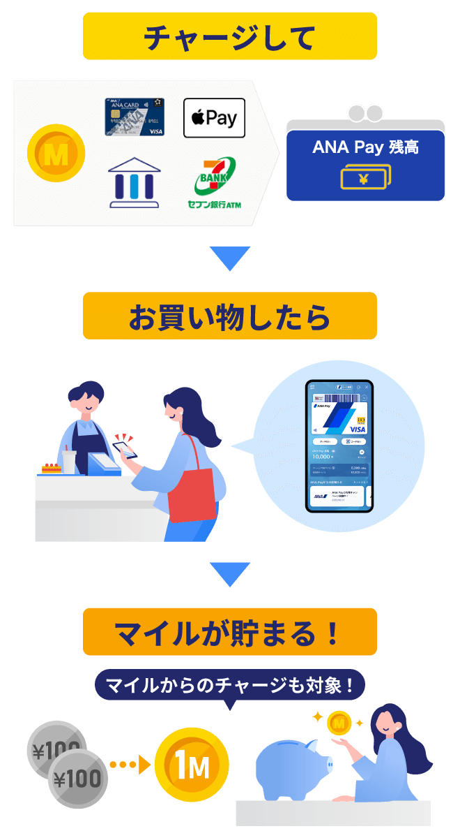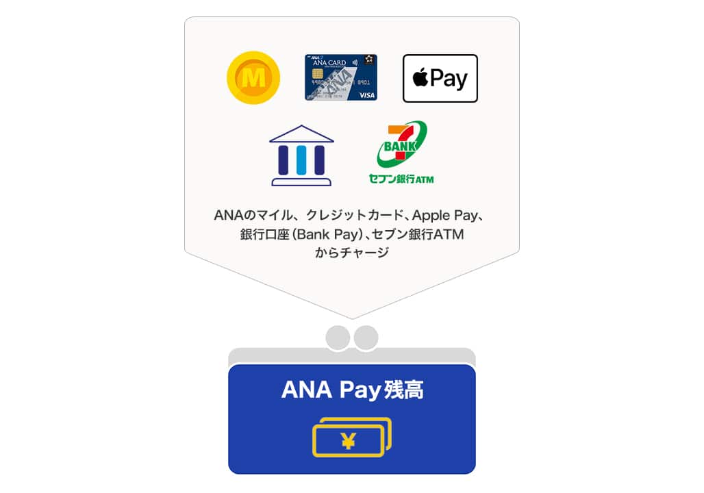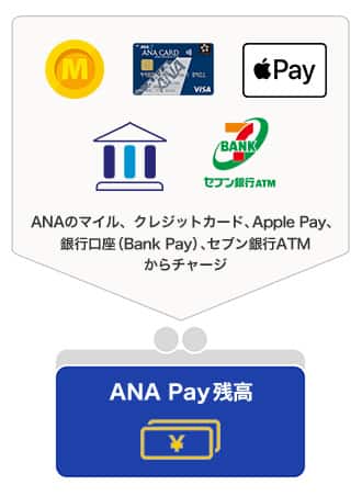 | ANA Pay残高 | クレジットカード 銀行口座(Bank Pay) セブン銀行ATM Apple Pay ギフトコード |