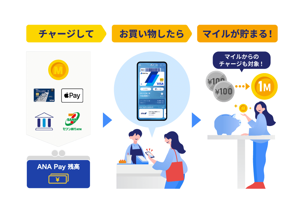 ANA Payではお持ちのマイルを1マイル1円相当としてチャージし、コンビニやスーパーなどの日常のお買い物からネットショッピングまでご利用いただけます。