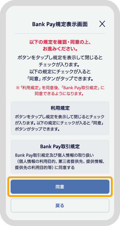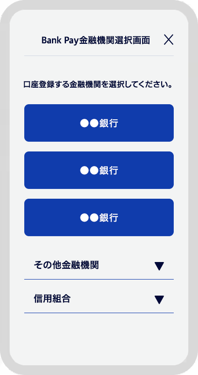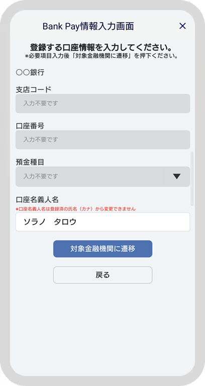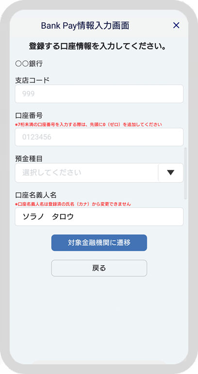 Bank Pay情報入力画面にて必要事項をご入力ください。金融機関によっては各項目への入力が不要な場合があります。その場合は、下部の「対象金融機関に遷移」ボタンをタップすると、各金融機関の登録ページへ遷移しますので、画面の案内に沿って、ご登録情報を入力します。