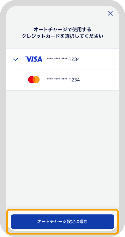 クレジットカードを複数登録されている場合は、 その中からオートチャージに利用するクレジットカードを選択し、 「オートチャージ設定に進む」をタップします。