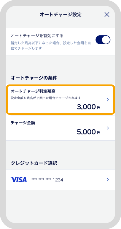「オートチャージ判定残高」をタップし、 オートチャージする条件となる設定金額を選択します。