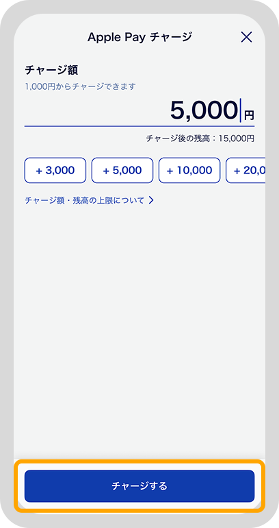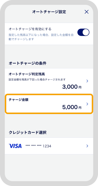 「チャージ金額」をタップし、 オートチャージ判定残高を下回った際に チャージする金額を設定したら、設定完了です。