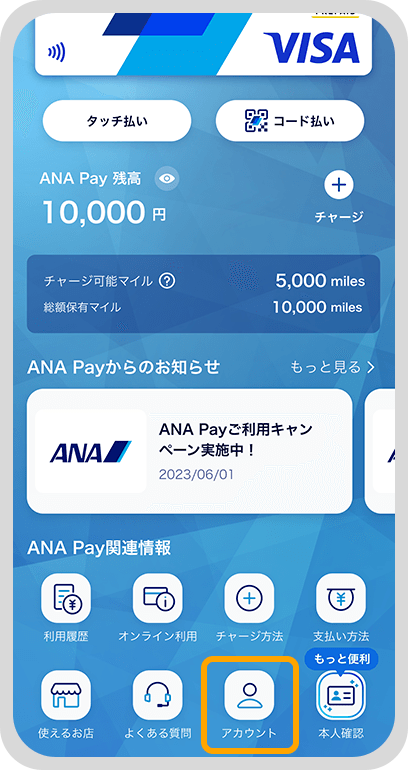 ANA Payにマイルをチャージする場合はメインカードでのログインが必要です。