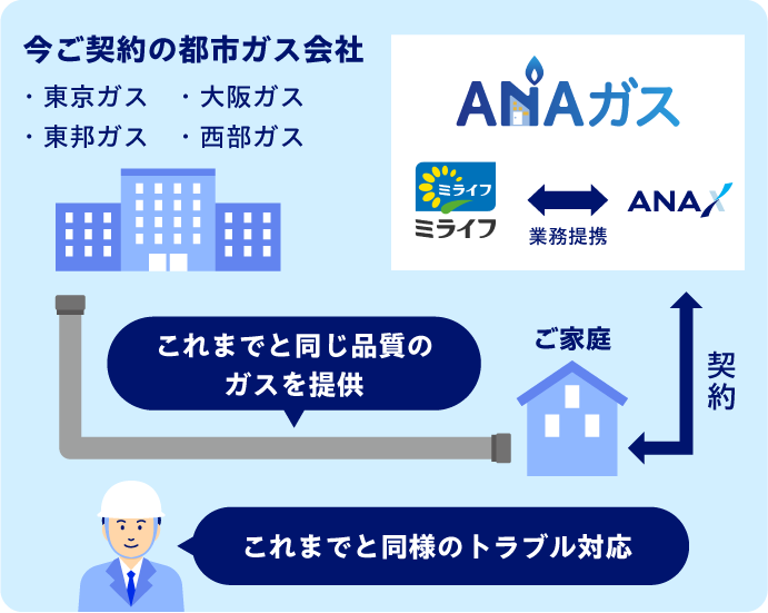 ANAガスに切り替えても、これまでと同じように東京ガス、東邦ガス、大阪ガス、西部ガスのガス管を通ってご自宅に届きます。ご契約によって、ガスの品質が変わることはありませんのでご安心ください。