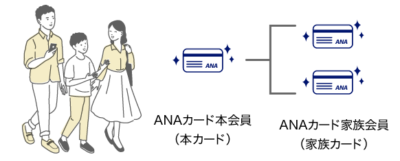 家族カードは、ANAカード本会員と生計を同一にする配偶者・ご両親・お子様(高校生を除く18歳以上)の方がお申し込みになれる本会員カードに付随したカードです。