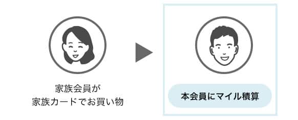 家族会員が家族カードでお買い物をすると、本会員にマイルが貯まります。
