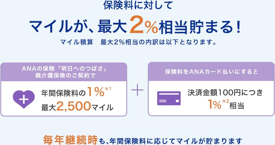 保険料に対してマイルが、最大2%相当貯まる!マイル積算 最大2%相当の内訳は以下となります。ANAの保険「明日へのつばさ」親介護保険のご契約で年間保険料の1%*1 最大2,500マイル+保険料をANAカード払いにすると決済金額100円につき1%*2相当 毎年継続時も、年間保険料に応じてマイルが貯まります 保険料に対してマイルが、最大2%相当貯まる!マイル積算 最大2%相当の内訳は以下となります。ANAの保険「明日へのつばさ」親介護保険のご契約で年間保険料の1%*1 最大2,500マイル+保険料をANAカード払いにすると決済金額100円につき1%*2相当 毎年継続時も、年間保険料に応じてマイルが貯まります