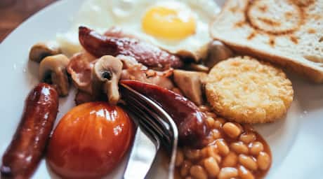 トマトのグリルや豆の煮たもの、ソーセージ、フライドエッグなどを盛った伝統的な朝食です。カリッと焼いたトーストと一緒に召し上がれ!