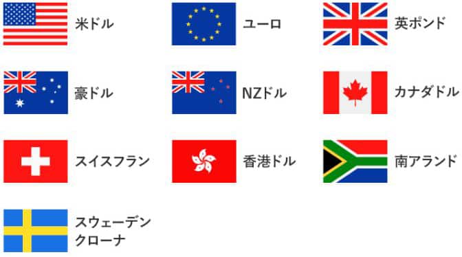 日本円のほか、米ドル、ユーロ、英ポンド、豪ドル、NZドル、カナダドル、スイスフラン、香港ドル、南アランド、スウェーデンクローナの10通貨が使えます。