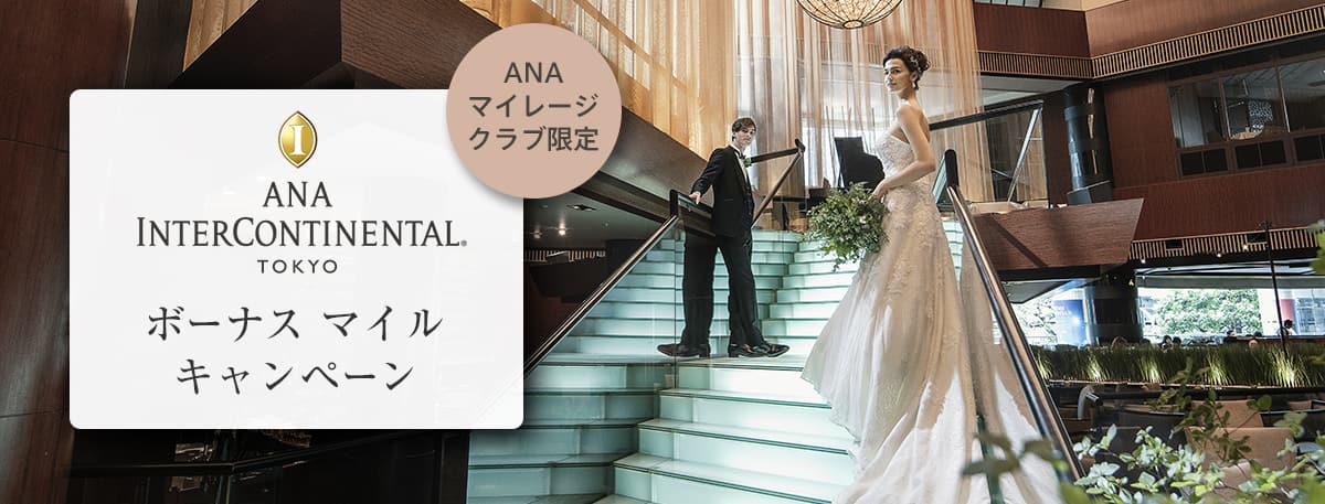 対象期間にANAインターコンチネンタルホテル東京での下見成約および披露宴実施で通常マイル(100円1マイル *1)とは別にボーナスマイル20,000マイルをプレゼント