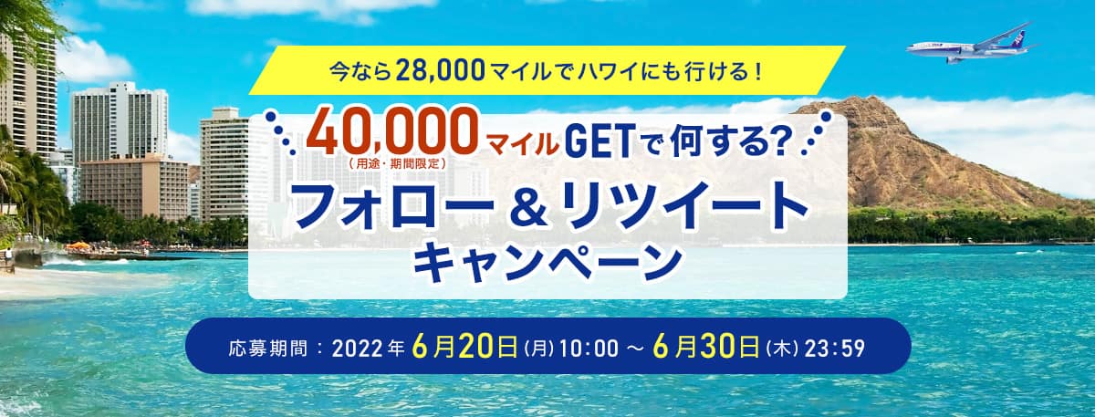 対象期間中、TwitterでANA公式アカウントをフォローして、対象のツイートをリツイートしていただいた方の中から、抽選で38名様にエコノミークラスのホノルル線往復分に相当する40,000マイル*をプレゼントいたします!