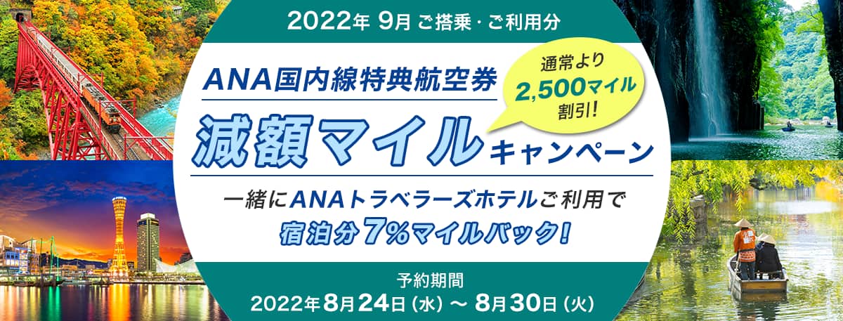 キャンペーン期間中、ANA国内線特典航空券を通常より2,500マイル割引でご利用いただけます。