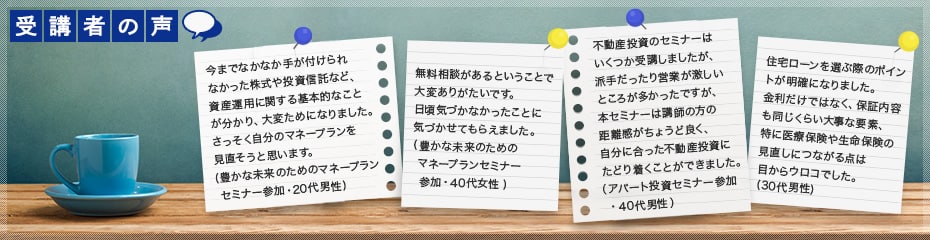 ライフプランセミナー、上場企業向け確定拠出年金講師、大学・金融機関主催の講師なども多数担当。