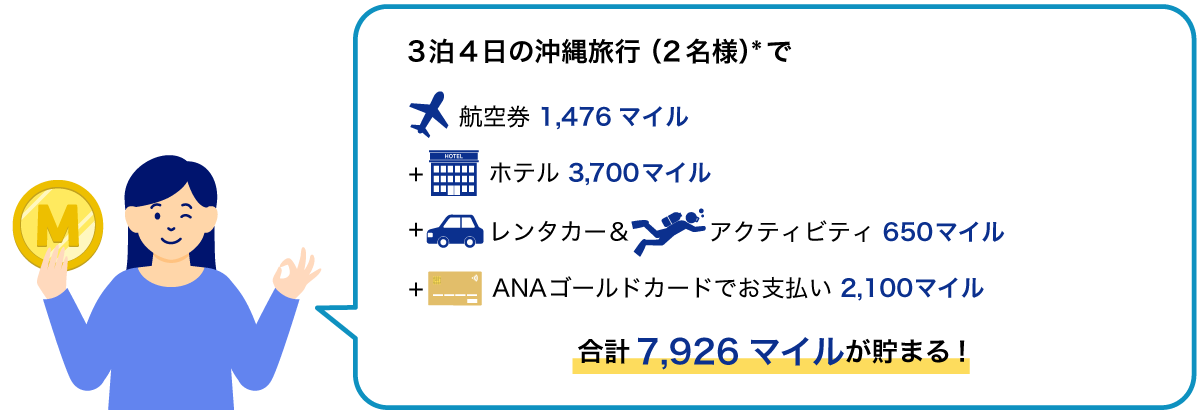 上記の沖縄旅行で貯まるマイルに加え、ANAゴールドカードを毎月100,000円ご利用(年間12,000マイル相当)で、1年間で「東京⇔沖縄航空券」に必要なマイル数を貯められます