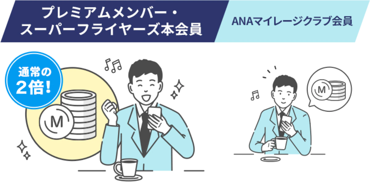 プレミアムメンバー・スーパーフライヤーズ本会員のお客様は、対象サービスをご利用の際、ANAマイレージクラブお客様番号(10桁)をご提示・ご登録のうえマイルを積算いただくと、通常の2倍マイルを積算いたします。