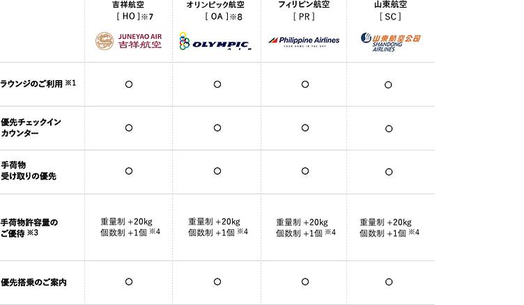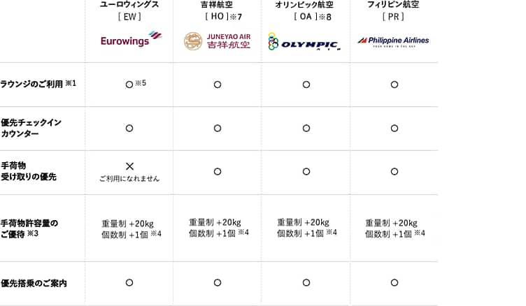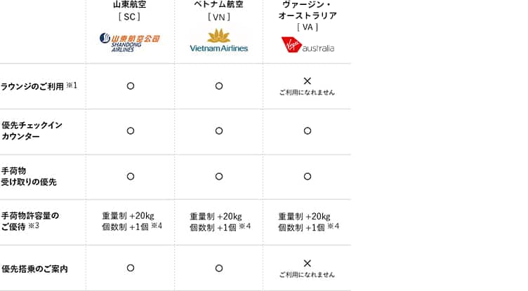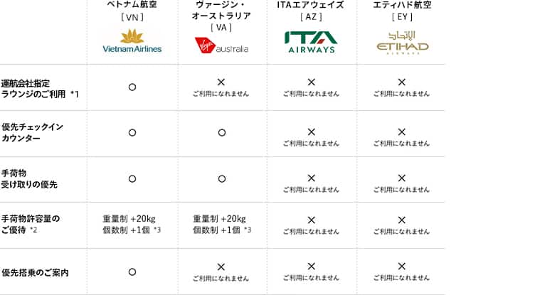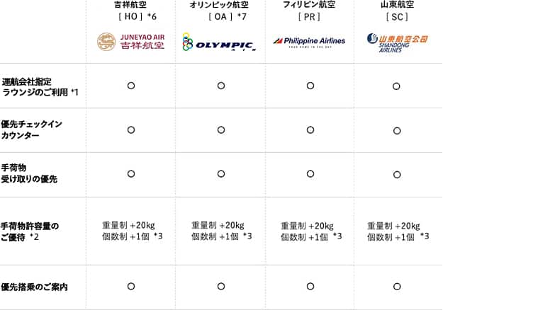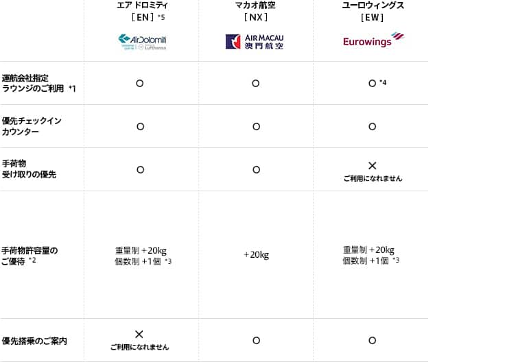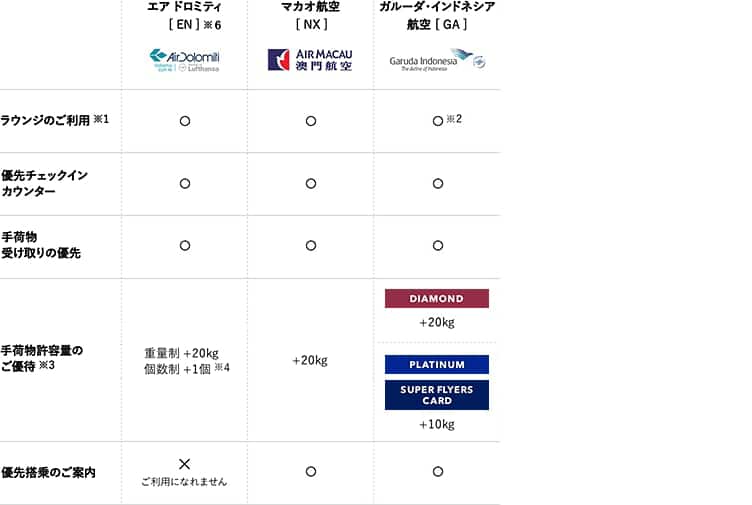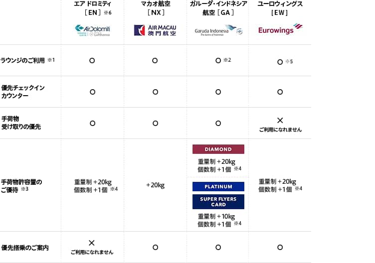 「ダイヤモンドサービス」「プラチナサービス」メンバー、スーパーフライヤーズ会員のお客様は、ご本人様に限り(一部のラウンジご利用を除く)、ステイタスカード*1のご提示により、対象の航空会社にてANAとのコードシェア便にご搭乗の際、下記のサービスをご利用になれます。