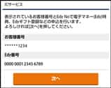お客様番号下4桁とEdy番号を確認のうえ、「次へ」を押します。