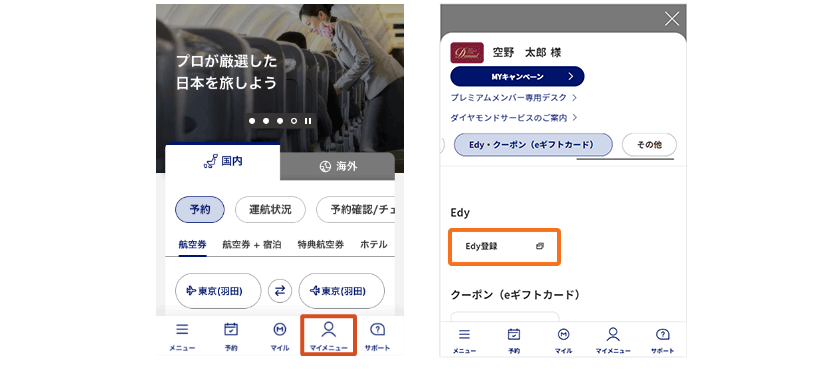 会員ログイン後、「マイメニュー」→「Edy・クーポン(eギフトカード)」より、「Edy登録」を選択します。